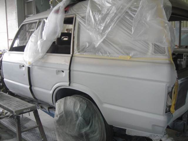 板金が終了したらパーツを足付けしてサフェーサーを塗装、乾燥させ水研ぎ、マスキングをして塗装工程へ。